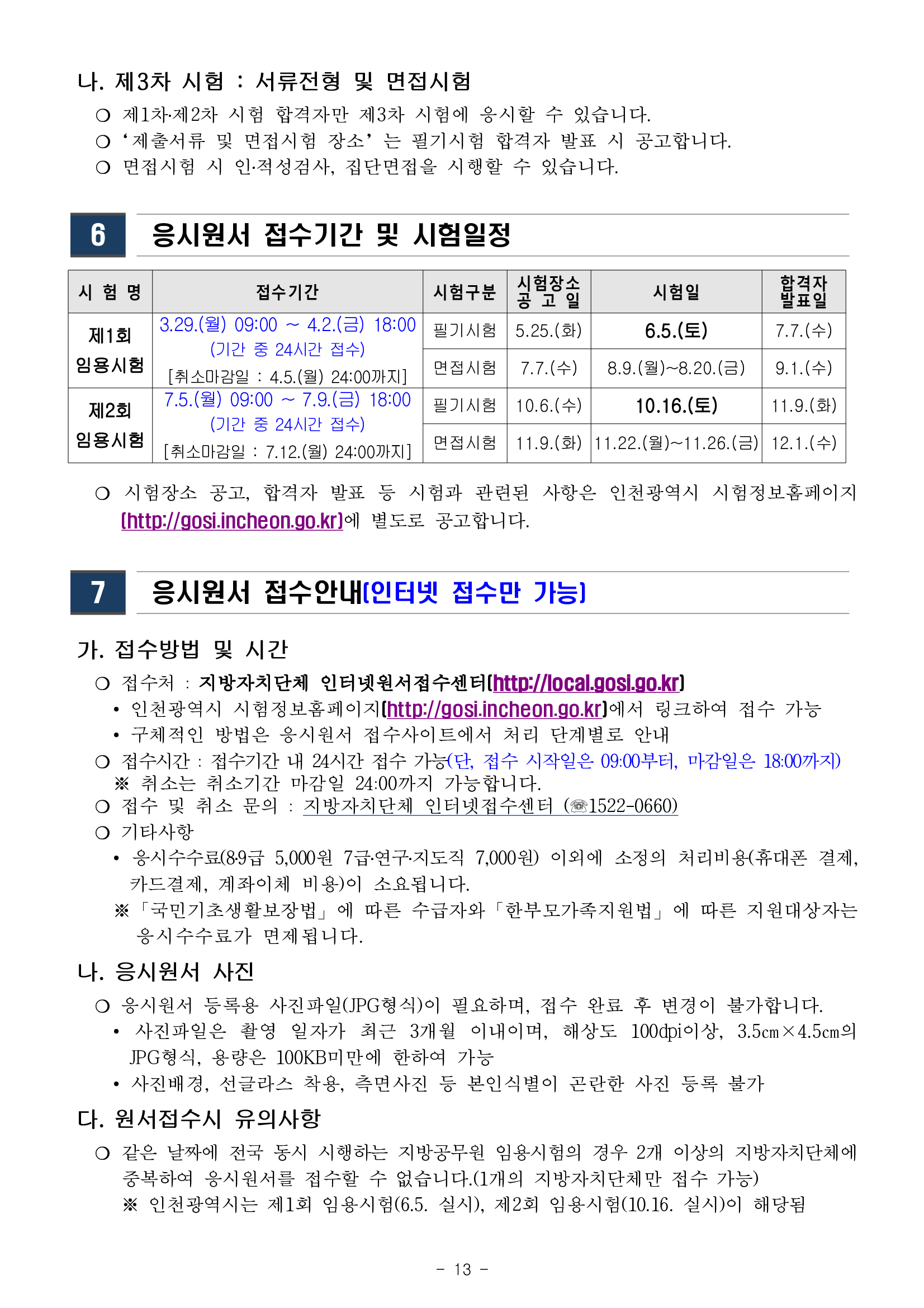 필기시험 합격자는 7월7일에 발표하고, 최종 합격자 발표는 9월1일에 진행된다고 하니 인천시 지방직 공무원 시험을 준비하시는 수험생분들께서는 응시원서 접수기간 및 시험일정을 꼭 확인하시기 바랍니다.