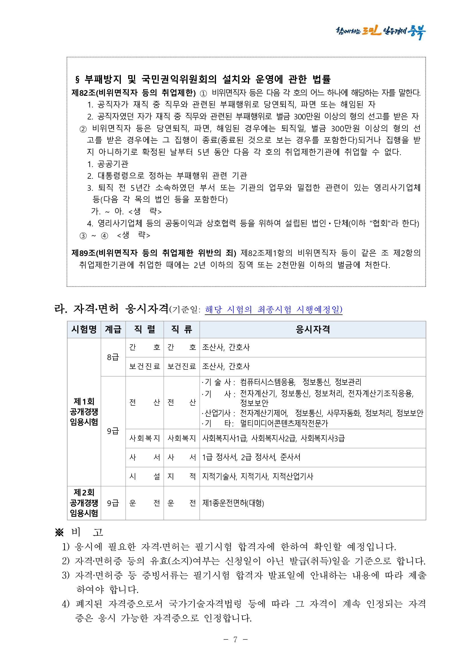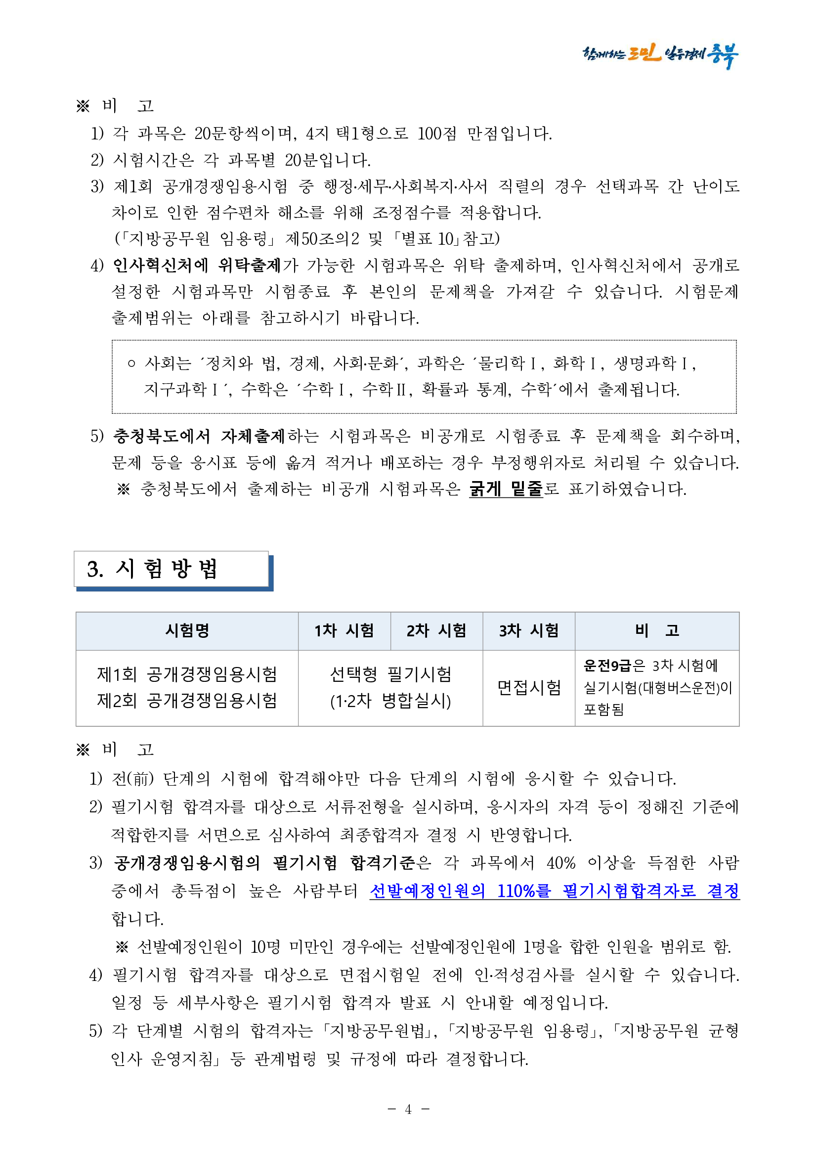 특히 충청북도 운전직 공무원은 국어 한국사 자동차구조원리및도로교통법규 등 3과목을 시험보게 되는데요. 별도 경력은 요구하지 않고 1종대형 운전면허만 있으면 응시자격이 있는것으로 확인됩니다.