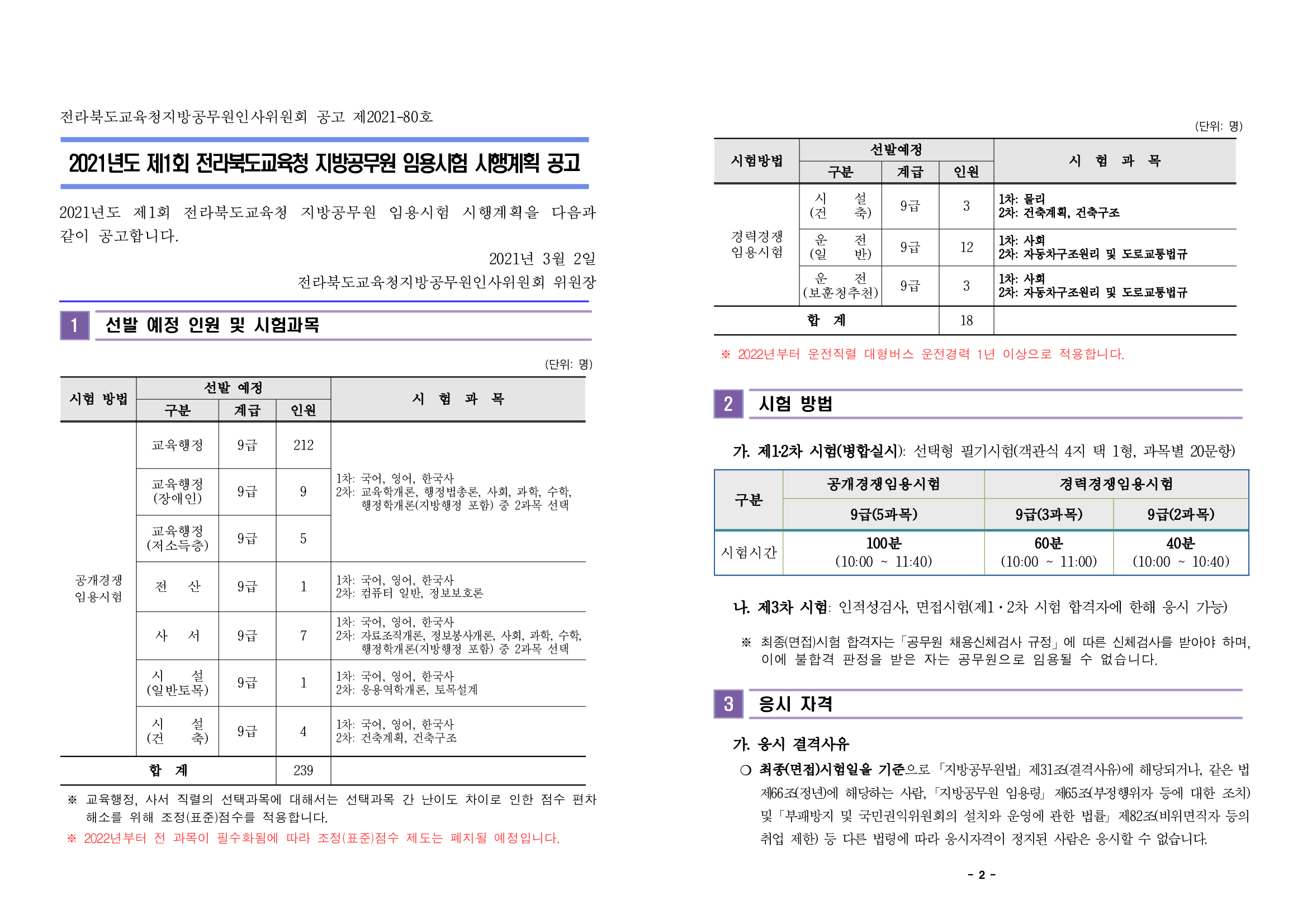 전라북도 교육청에서는 2021년 지방공무원 임용시험 시행계획을 아래와 같이 발표했습니다.