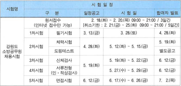 강원도 소방공무원 시험은 2월 18일 화요일부터 20일 목요일까지 진행을 합니다. 시간은 없지만 아마 오전 9시부터 진행을 하고, 접수 마감은 20일(목) 21시로 나와있지만 그전에 등록(결제)이 완료 되어야하니 화요일부터 바로 접수하시는게 낫겠습니다.