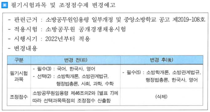 소방공무원 시험을 준비해야겠다고 계획하신 수험생분들 가운데 21년까지 목표로 하시는 분들은 상관없겠습니다만 22년까지 준비하시는 분들은 변경되는 시험과목도 꼼꼼하게 확인해보셔야겠습니다.
