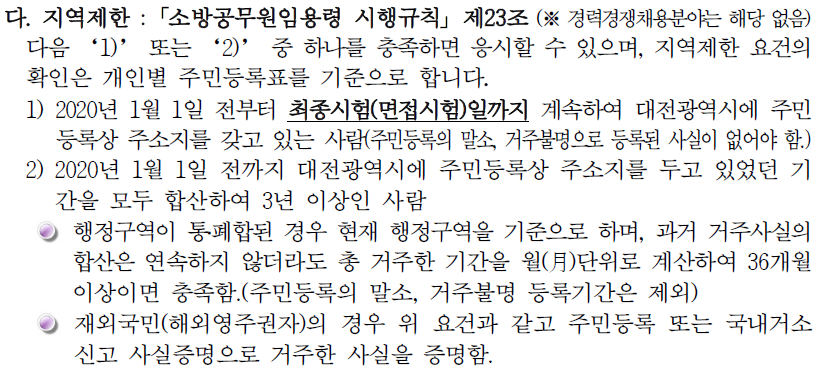 소방공무원은 지역제한을 두고 있습니다. 대전시 소방공무원 시험을 준비하시는 분들은 위의 지역제한을 확인하시고 응시하시면 되겠습니다.