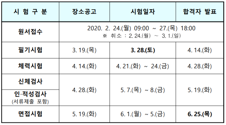 올해 부산시 소방공무원 채용시험 일정은 2월 24일 월요일 오전 9시부터 27일 목요일 오후6시까지 접수를 하게 됩니다. 접수 이후 3월 19일에 필기시험 장소공고를 하고, 3월 28일 토요일에 시험을 치르게 됩니다.