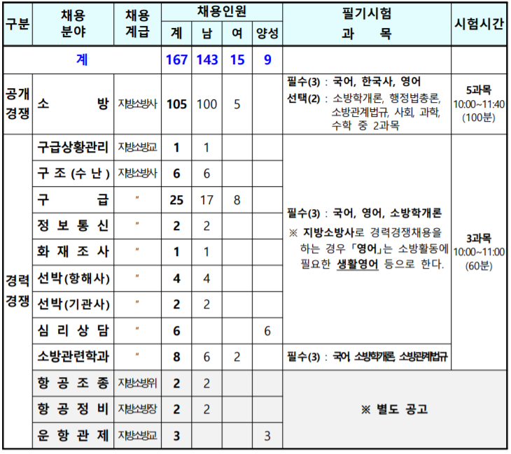 경채의 경우 채용분야별로 서로 다른 시험과목을 치르게 됩니다. 여기서 소방관련학과의 경우 다른 경채와 달리 영어시험이 없고, 국어, 소방학개론, 소방관계법규만 치른다고 하니 이점 참고 부탁드립니다.