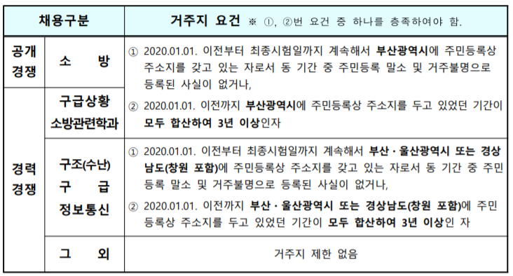 특히 공채와 경채 중 구급상황, 소방관련학과는 2020년 1월1일 이전부터 부산에 주민등록상 등록되어 있거니