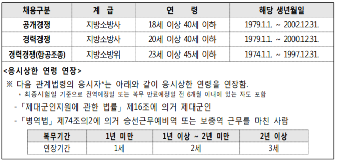 올해 광주 광역시 소방공무원 응시연령입니다. 군목무를 하지 않은 수험생들도 응시는 가능하지만 군복무를 마친 경우 최대 3세까지 응시 연령 가능하다고 하니 이점 참고 하시면 되겠습니다.