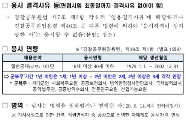경찰공무원 응시연령은 1979년 1월 1일부터 2002년 12월 31일 이내 출생자면 가능하고, 군복무 기간에 따라 최대 3세 연장가능합니다.
