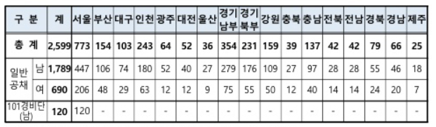 우선 공채의 경우 일반공채 남자, 여자, 101경비단(남) 등 3개 분야로 총 2,599명을 선발하게 됩니다.