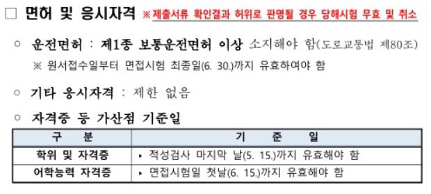 원서접수일부터 면접시험 최종일까지 유효해야하고, 학위 및 자격증이나 어학능력 자격증은 면접시험 첫날까지 유효해야한다고 하니 자격증의 유효기간을 꼼꼼히 확인해보셔야겠습니다.
