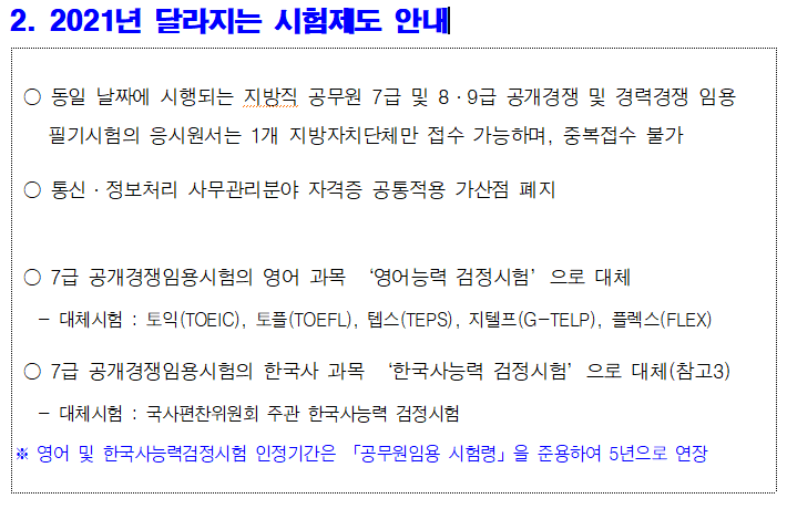 그리고 통신, 정보처리 사무관리분야 자격증 공통적용 가산점도 폐지되고, 7급은 영어 과목이 토익이나 토플, 텝스, 지텔프, 플렉스 등 영어능력 검정시험으로 대체됩니다. 추가로 7급 공개경쟁임용시험의 한국사 과목은 한국사능력 검정시험으로 대체 된다고 하니 이부분도 숙지하시길 바랍니다.