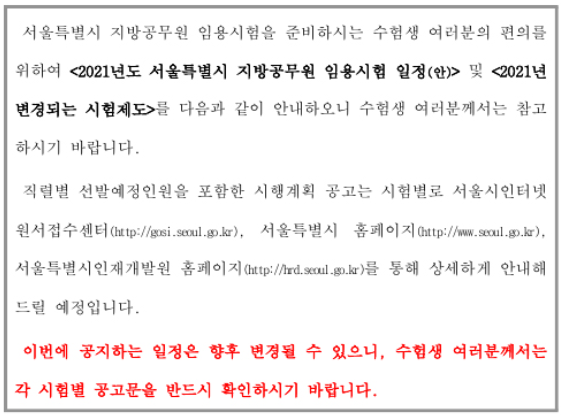 물론 이번에 공지되는 일정들인 향후에 변경될 수 있기 때문에 서울시 시험을 준비하시는 수험생분들은 반드시 각 시험별 공고문을 곡 확인하셔야됩니다.