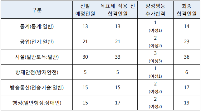 양성평등채용목표제 적용으로는 통계, 전기, 일반토목, 방재안전, 전송기술, 일반행정(장애)직의 6개 모집단위에서 11명(여 11명)이 추가 합격했다고 합니다. (양성평등목표제란, 어느 한 쪽 성별 합격자가 합격예정 인원의 30% 미만일 경우 해당 성별의 응시자를 추가 합격시키는 제도 입니다.)