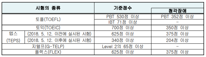 - 대체시험 : 토익(TOEIC), 토플(TOEFL), 텝스(TEPS), 지텔프(G-TELP), 플렉스(FLEX)