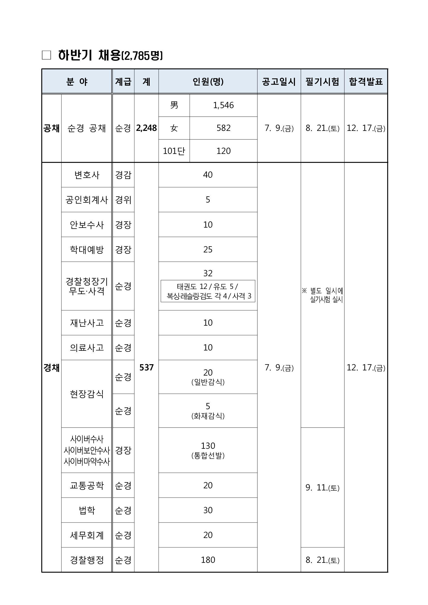 더욱히 올해는 경찰의 다양한 치안 활동 분야의 전문성을 위해 학대예방, 사이버 마약수사, 영상분석 분야 등 다양한 경력 경쟁 채용을 진행한다고 합니다.