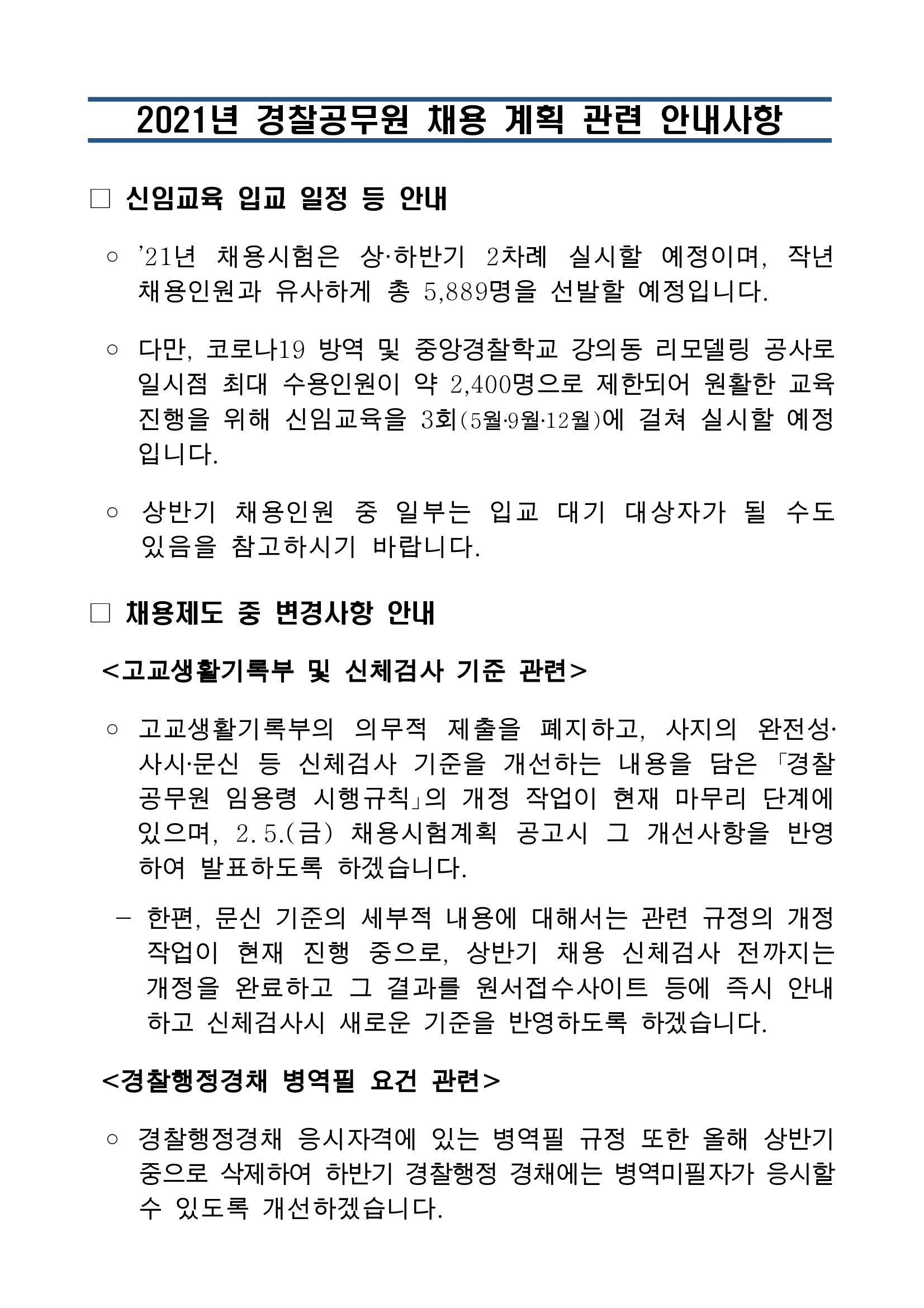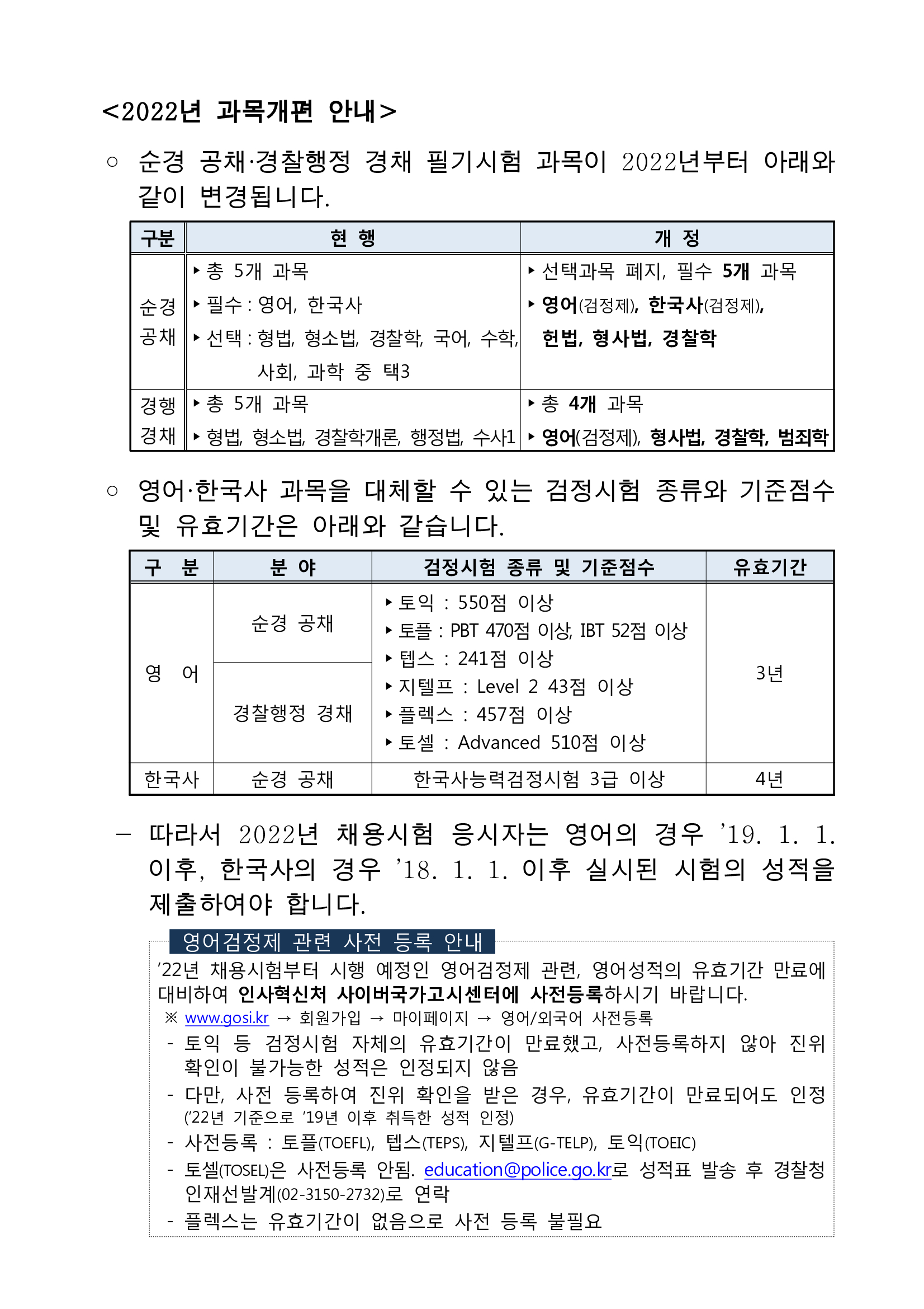 그리고 이번 공고에는 2022년부터 바뀌는 경찰 공무원 시험 과목 제도에 대해서도 안내하고 있으니 시험 공고문을 꼼꼼하게 확인 부탁드립니다.