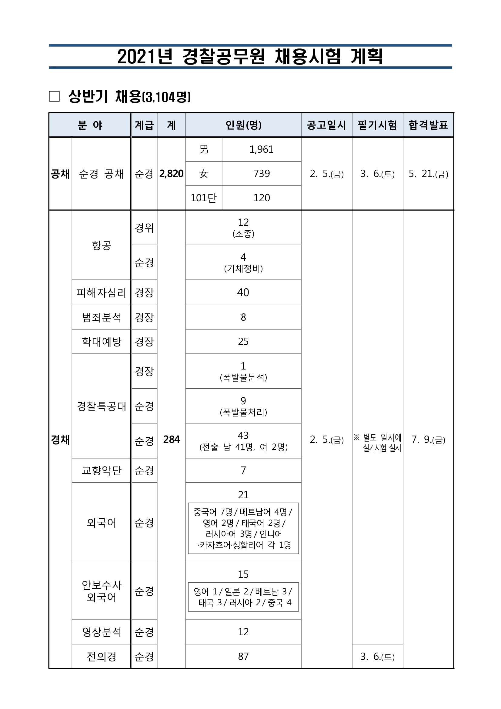 20201년 경찰공무원 시험 일정과 채용규모, 그리고 바뀌는 시험일정등이 발표되었습니다. 이번 채용계획에는 상반기에 3,104명 그리고 하반기에 2,785명을 선발한다고 합니다. 이 가운데 순경 공채의 경우 상반기에 2,820명, 하반기에 2,248명 등 총 5,068묭을 채용할 예정이고, 경력 공채의 경우 상반기에 10개 분야 284명, 하반기에는 13개 분야로 537명을 채용한다고 합니다.