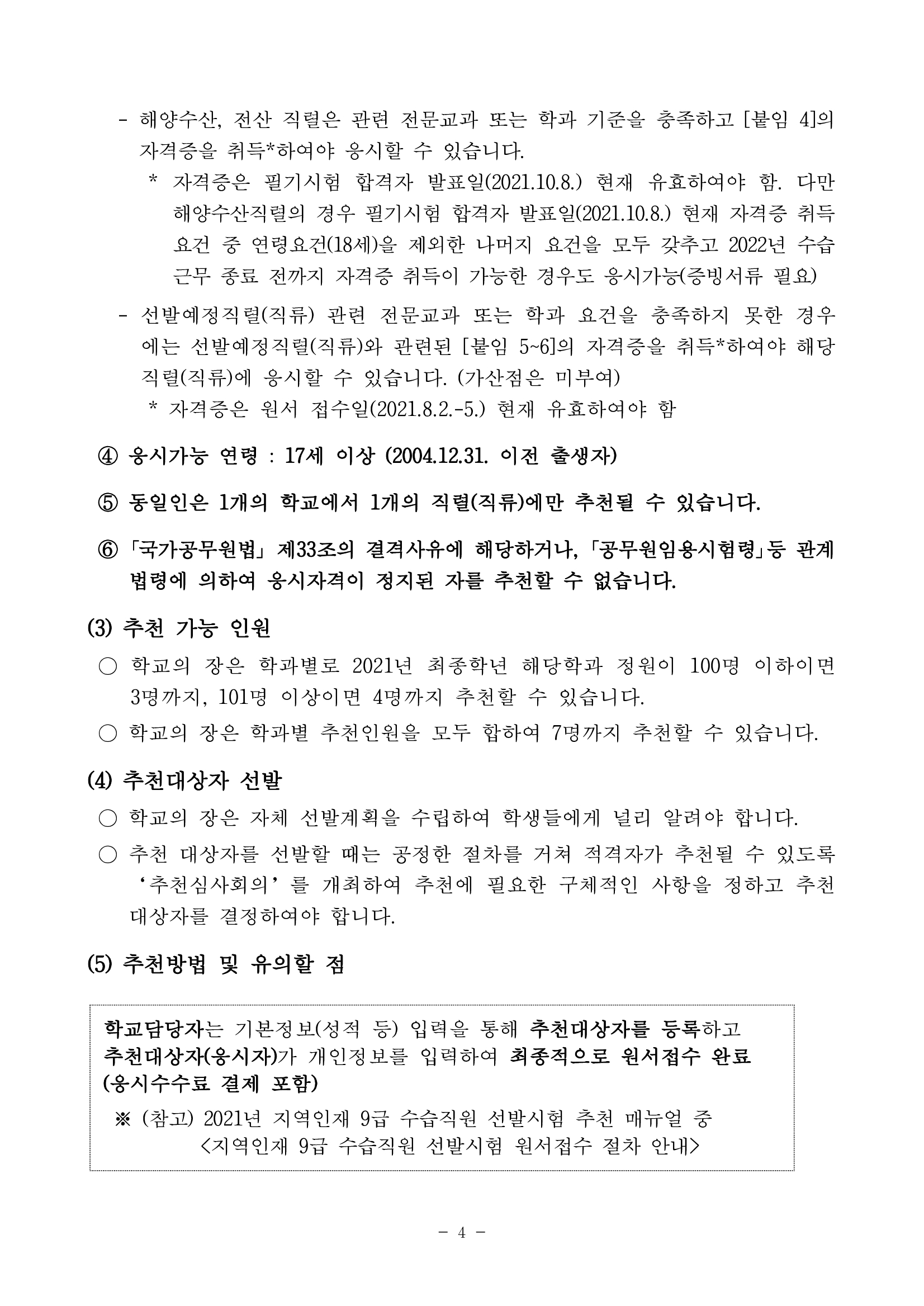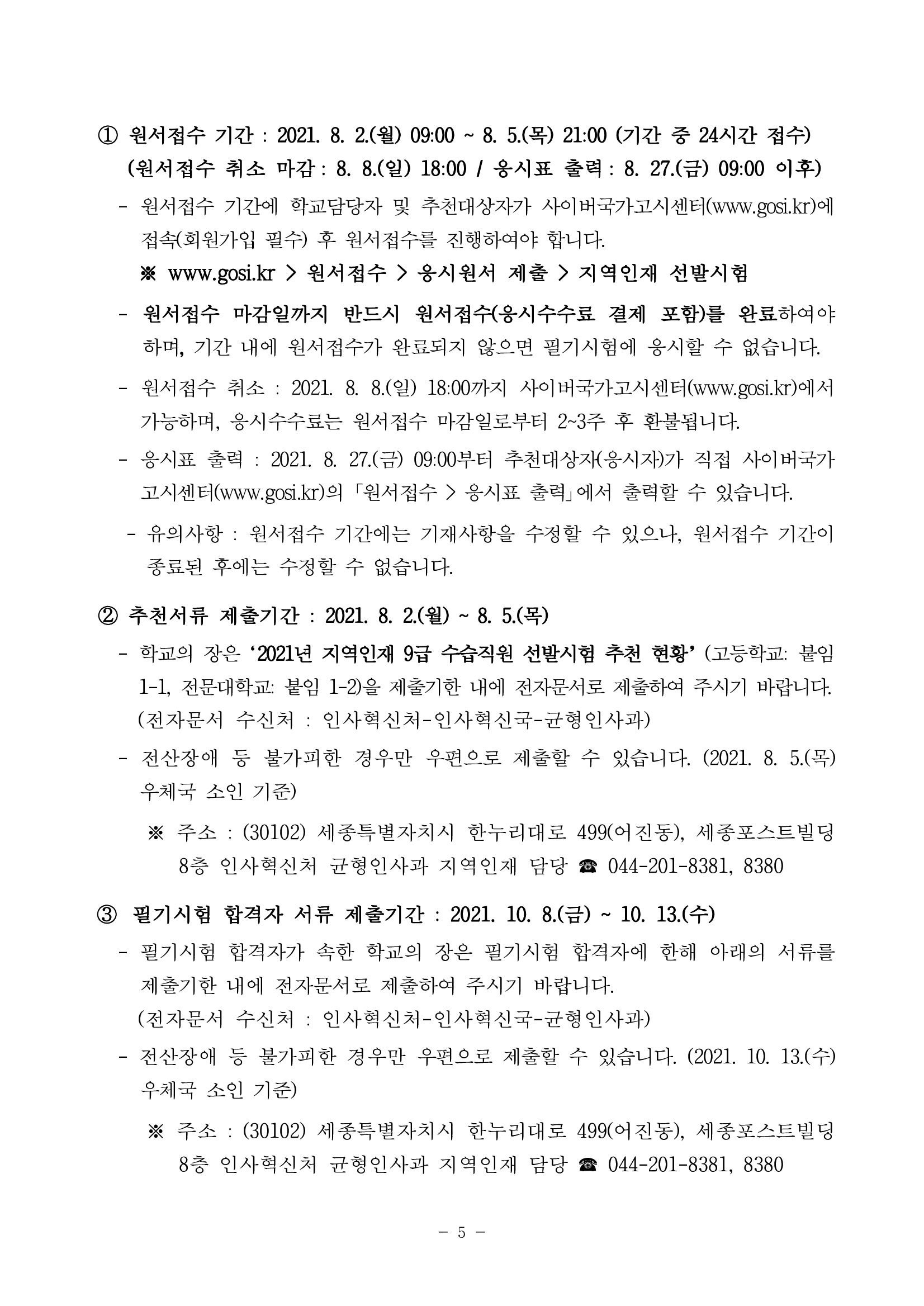 올해 지역인재 9급 수습 공무원시험의 원서접수는 8월 2일(월)부터 8월 5일(목)까지 진행되며, 원서접수 취소 마감일은 8월 8일이며 응시표 출력은 8월 27일(금) 이후부터 가능합니다. 원서접수 시 해당 수험생의 학교의 장은 8월 5일(목)까지 추천서류를 제출해야 한다.