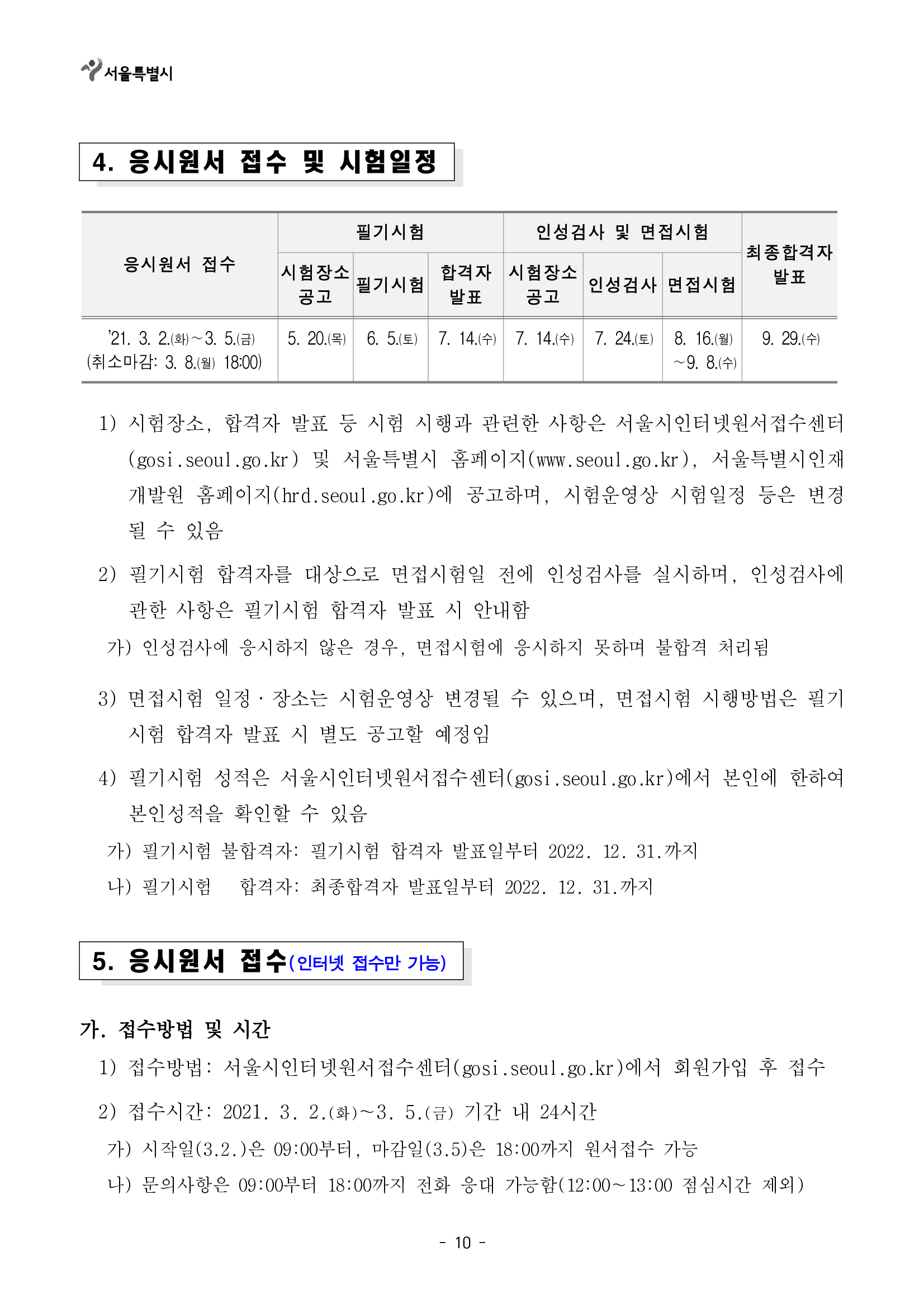 서울시 제 1회 공개경쟁 및 경력경쟁 임용시험은 3월2일부터 3월5일까지 서울시 인터넷 원서 접수 센터에서 진행되며